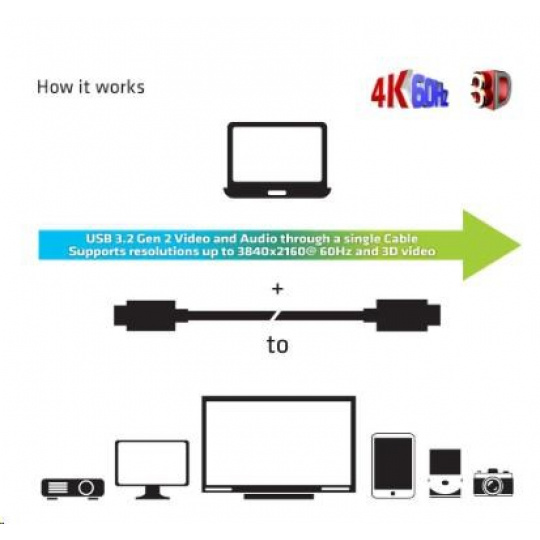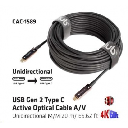 Kábel Club 3D CAC-1589 USB Gen 2 Type C AOC umožňuje pripojenie notebooku, tabletu alebo telefónu s výstupom USB Type C k najnovším periférnym zariadeniam a príslušenstvu USB C. Ponúka video a audio na jednej vzdialenosti 20 m/65.62 ft kábel.