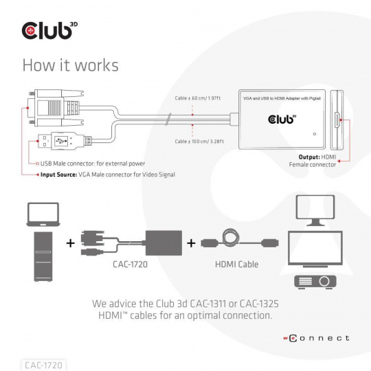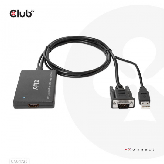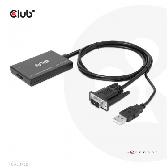 Adaptér Club 3D CAC-1720 VGA a USB Type-A na HDMI™ s pigtailom M/F 0.6m/1.97ft 28AWG spája akýkoľvek stolný počítač, notebook alebo adaptér vybavený VGA s monitorom, displejom, žiaričom alebo projektorom s portom HDMI™ Male. Adaptér je ideálny na použitie doma alebo v práci, vytvára spoľahlivé pripojenie na čokoľvek od hrania hier až po premietanie videa a podporuje rozlíšenie Full HD 1080p (max. rozlíšenie 1920 x 1080). Pre externé napájanie je k dispozícii aj port USB typu A. Tento kvalitný kábel VGA na HDMI™ poskytuje vynikajúci výkon vďaka kombinácii pozlátených konektorov a 28 AWG vodičov. Vnútorné tienenie znižuje presluchy, potláča šum a pomáha predchádzať elektromagnetickému rušeniu (EMI) a rádiofrekvenčnému rušeniu (RFI).