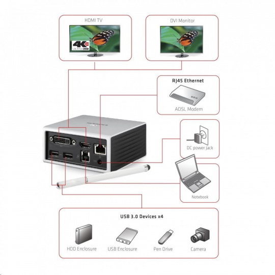 CSV-3104D Klub 3D USB 3.1 Gen 1 4K UHD Mini dokovacia stanica umožňuje rozšíriť výstupy notebooku alebo ultrabooku, takže ho možno používať ako tradičný stolný počítač.