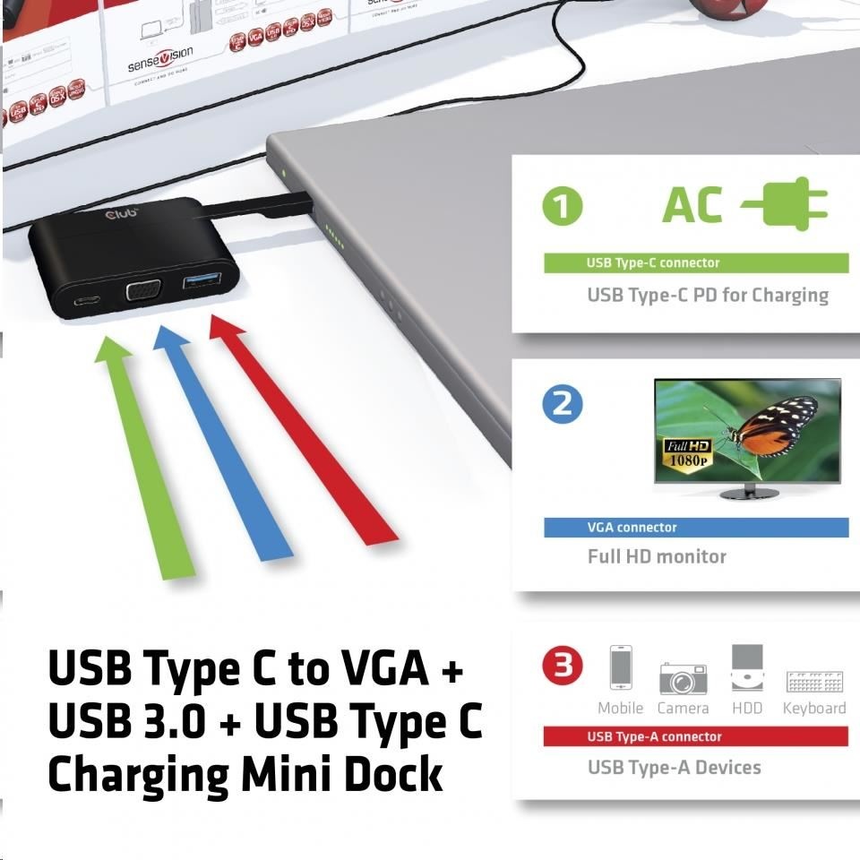 CSV-1532 The SenseVision USB Type C to VGA + USB 3.0 + USB Type C Charging Mini Dock is a portable and indispensable tool for your USB Type-C enabled laptop or Ultrabook featuring DisplayPort™ Alternate Mode. Add an analog VGA monitor with up to WQXGA 2560x1600p resolution through the D-Sub output while the USB 3.0 Type-A port connects your USB Sticks, Peripherals and HDD’s.