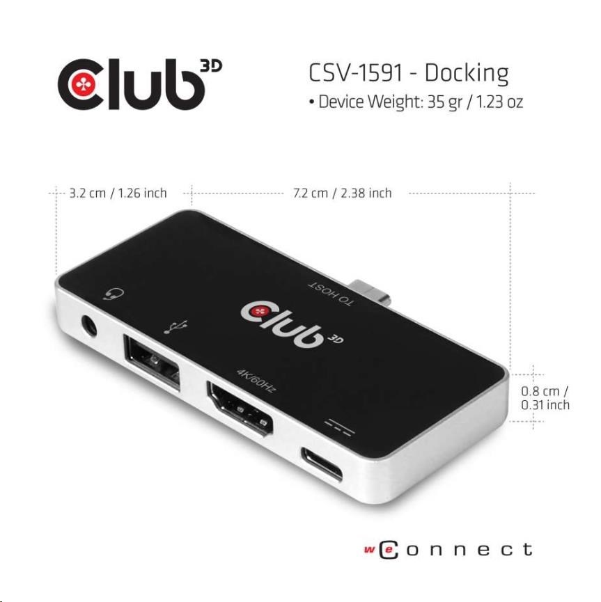 CSV-1591 - Club 3D Hub je rozbočovač 4 v 1 USB typu C s rozhraním HDMI™, USB typu A 2.0, 3.5 mm audio a nabíjanie cez USB typu C PD, dizajn dokonale vyhovuje všetkým zariadeniam s režimom DP Alt. S týmto rozbočovačom si môžete vychutnať video s ultra vysokým rozlíšením hostiteľa na veľkej obrazovke, vychutnať si fantastickú hudbu, prenášať USB 2.0 a pripojte adaptér USB typu C PD na nabíjanie hostiteľa.