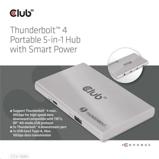 Club 3D CSV-1580 je certifikovaný prenosný rozbočovač Thunderbolt™ 4, ktorý poskytuje najpokročilejšie, najefektívnejšie a najvšestrannejšie dostupné I/O riešenie s rýchlosťou až 40 Gb/s pre dáta a video. Tento moderný rozbočovač Thunderbolt™ 4 má po prvýkrát 3 nadväzujúce porty Thunderbolt™ 4, ktoré umožňujú kaskádové pripojenie zariadení Thunderbolt™ 4 k jednému 8K30Hz alebo dvom 4K60Hz monitorom, možno ho tiež ľahko pripojiť k akémukoľvek zariadeniu USB typu C a súčasne nabíjať počítač. Okrem toho podporuje funkciu Smart Power, ktorá umožňuje rozdeľovať energiu podľa spotreby pripojeného zariadenia a plne tak využívať externý zdroj napájania. Je určený pre počítače PC s rozhraním Thunderbolt™ 4 a počítače Mac™ s rozhraním Thunderbolt™ 3, ktoré používajú systém macOS™ 11 a novšie verzie.