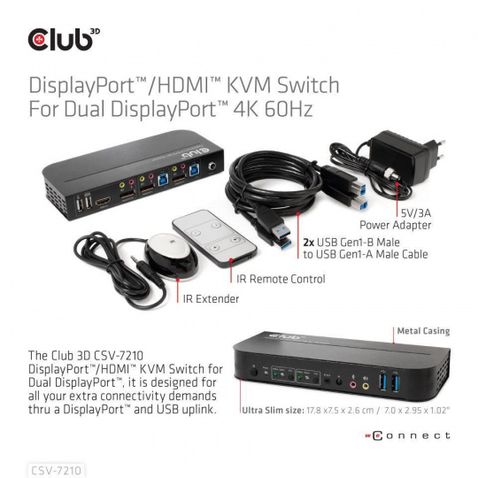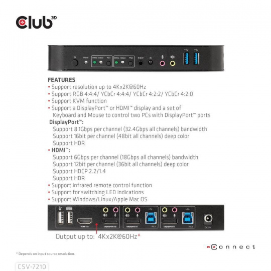 CSV-7210 je vysoko výkonný prepínač KVM (klávesnica, video a myš) s rozhraním DisplayPort™. Presmeruje videá s vysokým rozlíšením až do 4096 × 2160 pri 60 Hz rozlíšení a zvuk z akéhokoľvek zdroja DisplayPort™ na akýkoľvek displej s podporou HDMI™ alebo DisplayPort™. Tento prepínač DisplayPort™ KVM má nielen funkciu prepínania stlačením tlačidla, ale aj inteligentnú funkciu a funkciu hot pluggable.