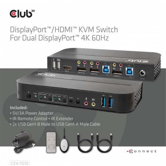 Club3D Network Switch - Prepínač, DP/HDMI KVM prepínač - Dual DP 4K 60Hz