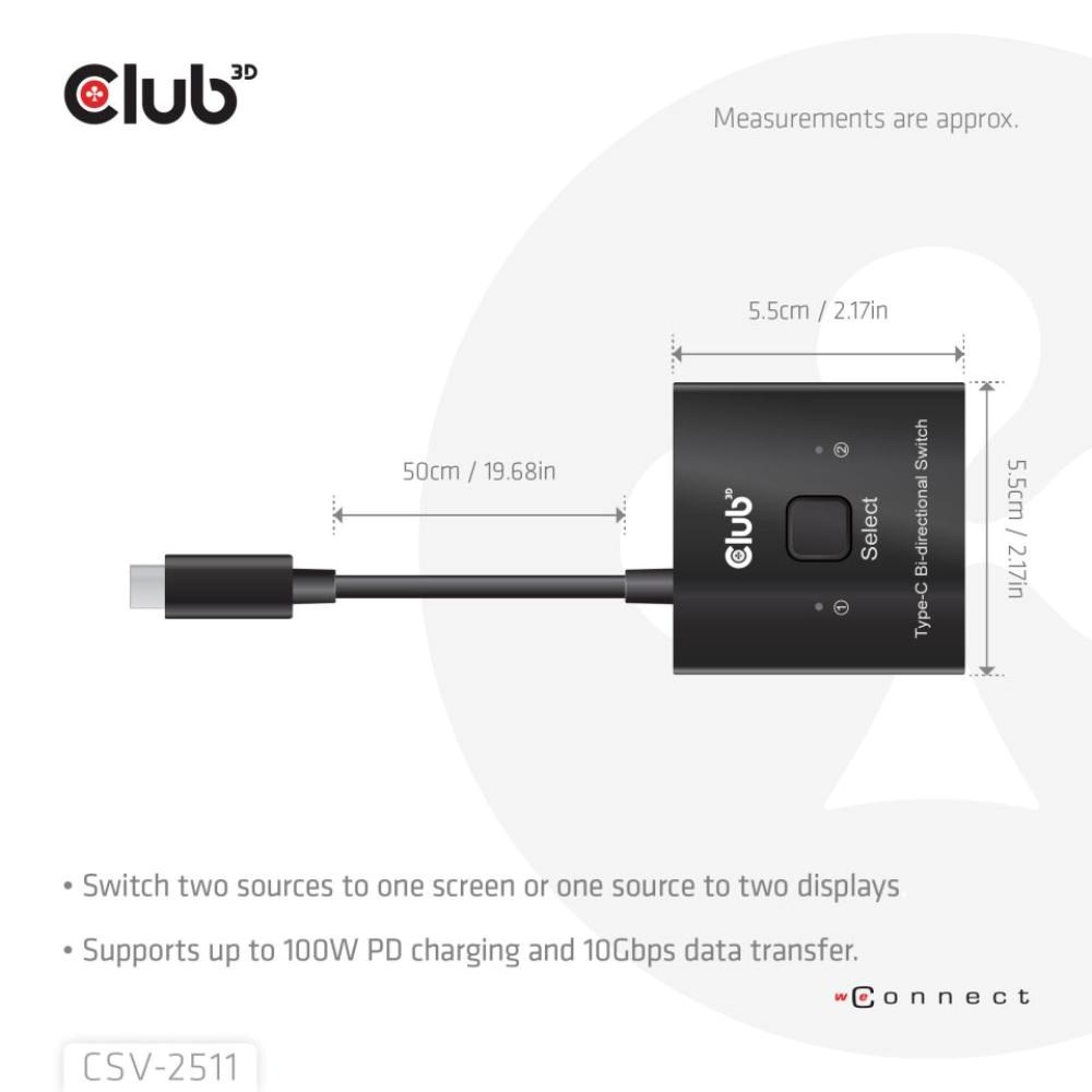 Plnohodnotný obousmerný prepínač Club 3D CSV-2511 môže prepínať dva zdroje na jeden displej alebo jeden zdroj na jeden zo dvoch displejov. Tento prepínač podporuje viac rozlíšení a až 8K alebo prenos dát max. 10 Gb/s alebo nabíjanie PD3.0 max. 100 W PD. Môže pracovať na všetkých hostiteľských zariadeniach USB-C®, kompatibilných so zariadeniami Thunderbolt.