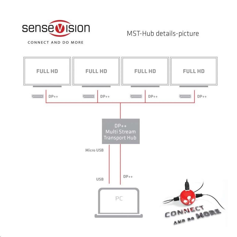 Rozbočovače Club 3D SenseVision MST využívajú technológiu Multi Stream Transport, jedinečnú funkciu DisplayPort ™ 1.2, ktorá umožňuje prenášať viac nezávislých nekomprimovaných video (a audio) tokov na jedinom kábli To umožňuje použitie viacerých monitorov pripojených pomocou rozbočovača MST. Rozbočovače Club3D MST sú schopné distribuovať tieto video toky na pripojené obrazovky.