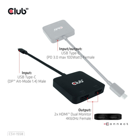 Club 3D CSV-1558 USB Type-C na Dual HDMI™ 4K60Hz + PD 100 watt Nabíjanie v režime DP1.4 Alt, umožňujúce rozšíriť port USB Type-C hostiteľa na 2x HDMI™ displeje s ultra vysokým rozlíšením max 4K60Hz pre každý displej súčasne. Vďaka podpore funkcie MST je možné zobraziť duálne displeje s rôznym obsahom videa súčasne. Okrem toho podporuje nabíjanie PD s maximálnym výkonom 100 W. Môže fungovať na všetkých zariadeniach USB Type-C alebo Thunderbolt™ s podporou režimu DP™ Alt (vrátane telefónov s pripojením USB Type-C a podporou režimu DP™ Alt).