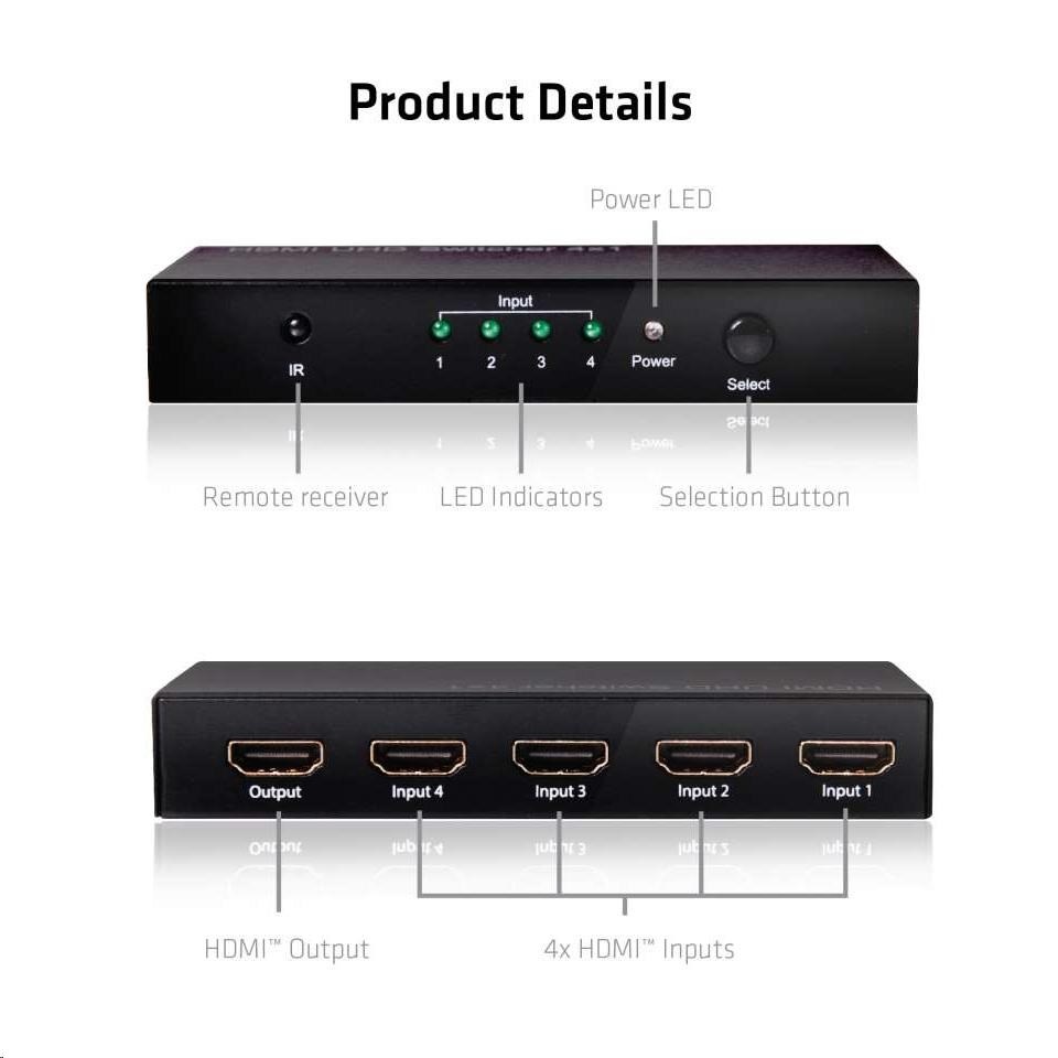 Club3D Video prepínač 4:1 HDMI 2.0 4K60Hz UHD, 4 porty