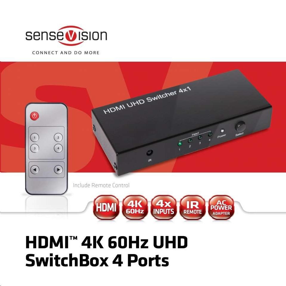 SenseVision HDMI ™ 2.0 UHD 4K60Hz SwitchBox 4 port je vysoko výkonný a malý prepínač HDMI ™ 2.0 UHD 4K60Hz so štyrmi vstupmi a jedným výstupom. Má matný čierny kovový plášť, ktorý je veľmi silný a robustný. Ideálny asistent ako doma, tak aj na pracovisku. Tento prepínač HDMI ™ 2.0 UHD 4K60Hz prenáša video vo vysokom rozlíšení až v 4k @ 60Hz a digitálny zvuk z akéhokoľvek zo 4 vstupov zdroja do pripojeného (4K UHD) televízoru, monitoru alebo projektoru.