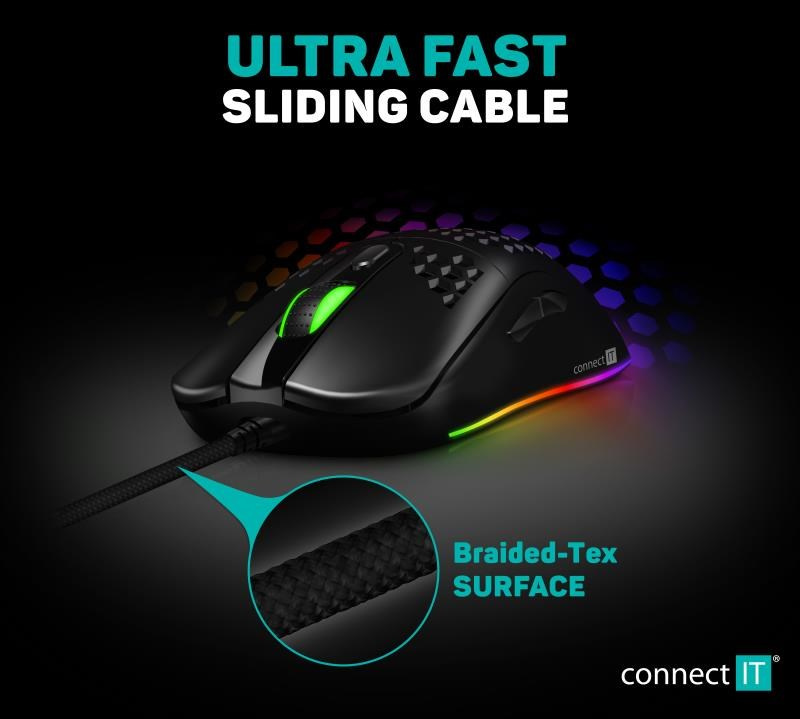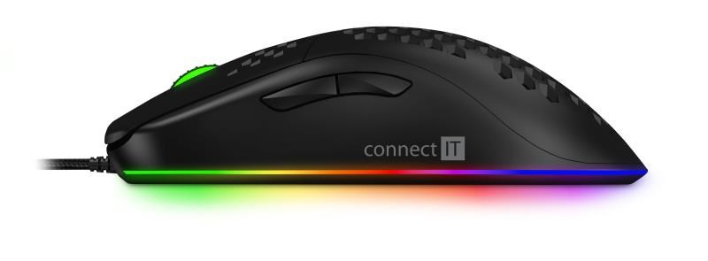 Okrem bežných funkcií je táto myš jedinečná svojou odlehčenou konštrukciou. Vďaka perforácii tela myši a tlačidiel špeciálnym hexagonálnym tvarom, ktorým došlo k zníženiu váhy myši o 50%. Tento typ perforácie zabezpečí maximálny grip a stabilitu pri dlhodobom hraní. K tejto myši je dodávaný softvér na stiahnutie úplne zadarmo na stránkach www.connectit-europe.com. Samozrejmosťou je u tejto série prémiový opletený napájací kábel a pozlátený USB konektor.