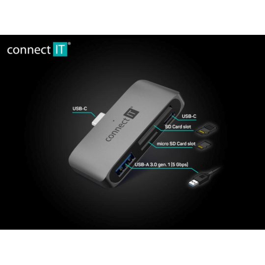 Connect IT CompactPROPraktická USB-C čtečka paměťových karet a USB hub CompactPRO umožňuje přenášet data a obsah mezi vašimi paměťovými kartami a mobilním telefonem či počítačem. Disponuje USB-C a USB-A 3.0 portem a sloty pro SD a MicroSD kartu.Díky kompaktní velikosti se vejde do kapsy a můžete jí mít tak kdykoliv po ... viac