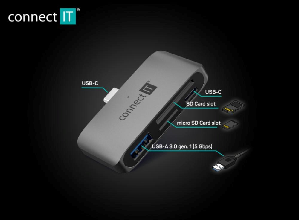 Connect IT CompactPROPraktická USB-C čtečka paměťových karet a USB hub CompactPRO umožňuje přenášet data a obsah mezi vašimi paměťovými kartami a mobilním telefonem či počítačem. Disponuje USB-C a USB-A 3.0 portem a sloty pro SD a MicroSD kartu.Díky kompaktní velikosti se vejde do kapsy a můžete jí mít tak kdykoliv po ... viac
