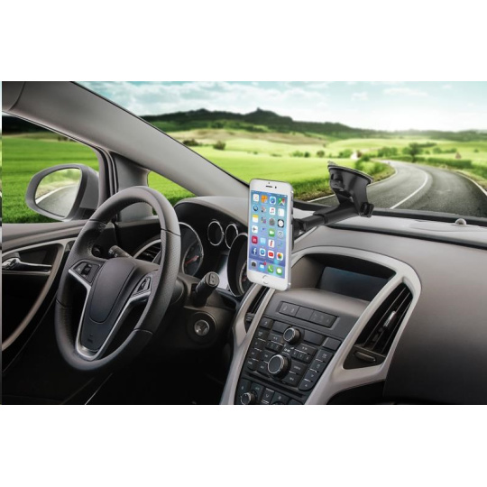 - Pripevňuje sa na palubnú dosku alebo čelné sklo vozidla