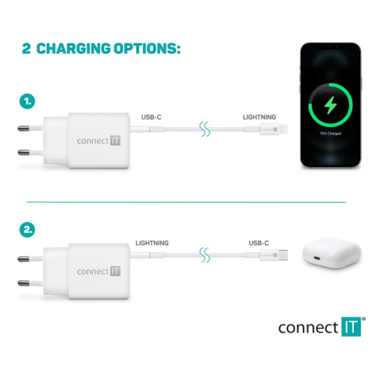 CONNECT IT Duplex nabíjecí adaptér 1xLightning, 1×USB-C, 20W, 1xLightning - USB-C kabel, bílá