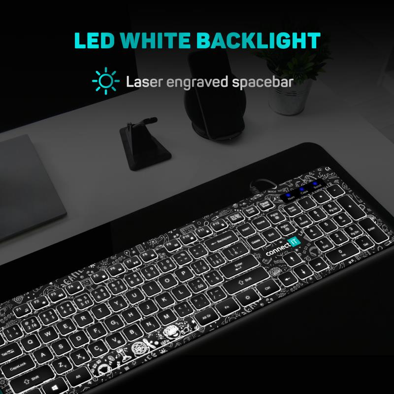 CONNECT IT DOODLE kancelářská drátová bíle podsvícená USB klávesnice, CZ + SK verze, ČERNÁ