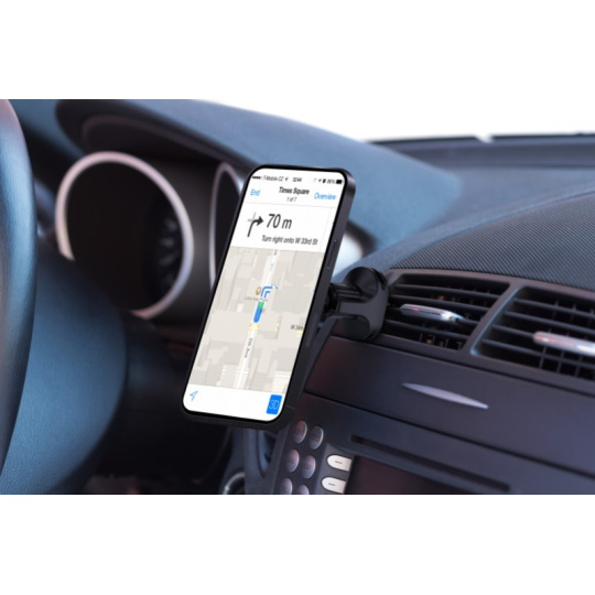 Pozícia v klimatizačnej mriežke spĺňa bezpečnostné podmienky pre umiestnenie mobilného telefónu v aute, kedy telefón nebráni vodičovi vo výhľade. Inštalácia je veľmi jednoduchá - stačí len zatlačiť aretačný hák do klimatizačnej mriežky a utiahnuť pomocou aretačného kolieska. Potom už stačí len priblížiť telefón zadnou stranou k držiaku a vplyvom magnetickej sily sa sám upevní na držiaku. Držiak ponúka rovnakú stabilitu ako vo vertikálnej, tak aj v horizontálnej polohe.