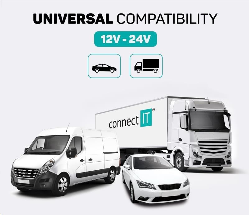 - Kompatibilný so všetkými 12/24 V zásuvkami cigaretového zapaľovača v osobných a nákladných vozidlách