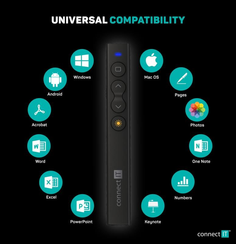 - Úložný priestor v spodnej časti prezentéra pre mini USB prijímač, ideálny pri transporte aj cestovaní