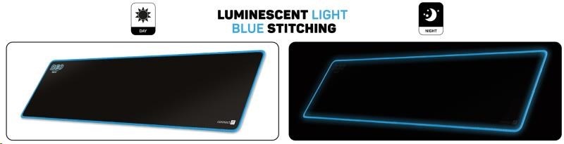 Podložka má mäkký a príjemný povrch. Vďaka hracej ploche 886 x 245 mm vám nikdy nebude chýbať priestor na pohyb. Veľkou výhodou je pogumovaná protišmyková spodná strana a antistatický povrch, na ktorom bude bez problémov jazdiť každá myš. Materiál bol navrhnutý tak, aby odpudzoval vodu a nečistoty. Podložka má okraje obšité špeciálnou vysokokvalitnou svietiacou niťou, ktorá v tme jemne svieti.