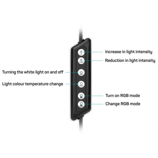 | Diaľkové ovládanie umožňuje | - zmena intenzity svetla v 9 úrovniach - nastavenie teploty farieb svetla - úplné zapnutie a vypnutie svetla - zapnutie a vypnutie režimu RGB - zmena svetelných efektov RGB |