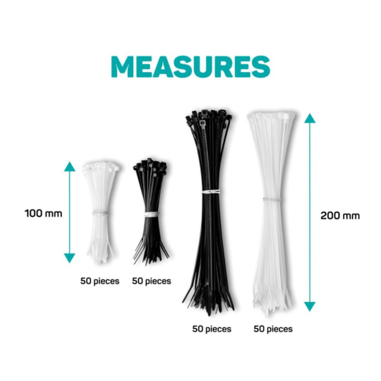 | Veľkosť a počet | - 50ks (čierna) 100mm - 50ks (biela) 100mm - 50ks (čierna) 200mm - 50ks (biela) 200mm |