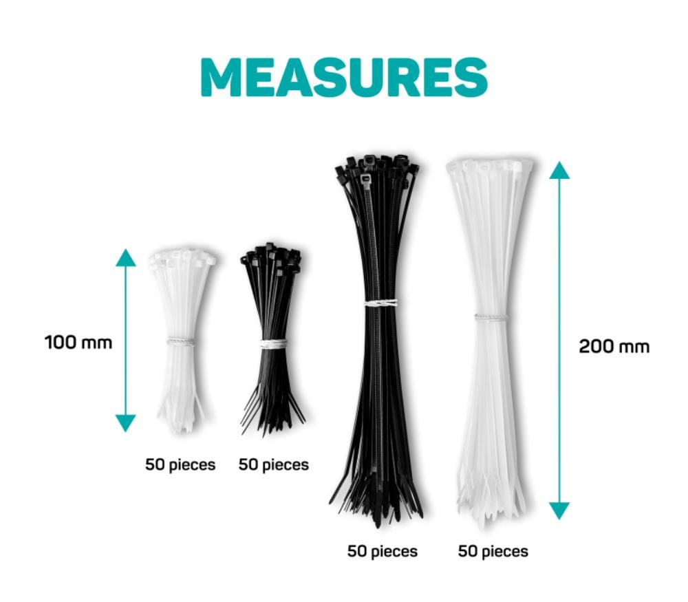 | Veľkosť a počet | - 50ks (čierna) 100mm - 50ks (biela) 100mm - 50ks (čierna) 200mm - 50ks (biela) 200mm |