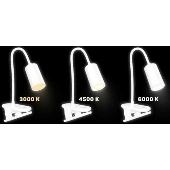 Díky flexibilnímu rameni nastavíte dokonalý úhel pro jakoukoliv práci. Lampička disponuje praktickým dotykovým spínačem, který umožňuje zapnout/vypnout lampu, plynule nastavit úroveň jasu světla nebo nastavit barevnou teplotu světla ve 3 různých úrovních (3000/4500/6500 K). Pomocí klipu můžete lampičku umístit nejen na Váš pracovní stůl, ale například na poličku, noční stolek či rám postele.