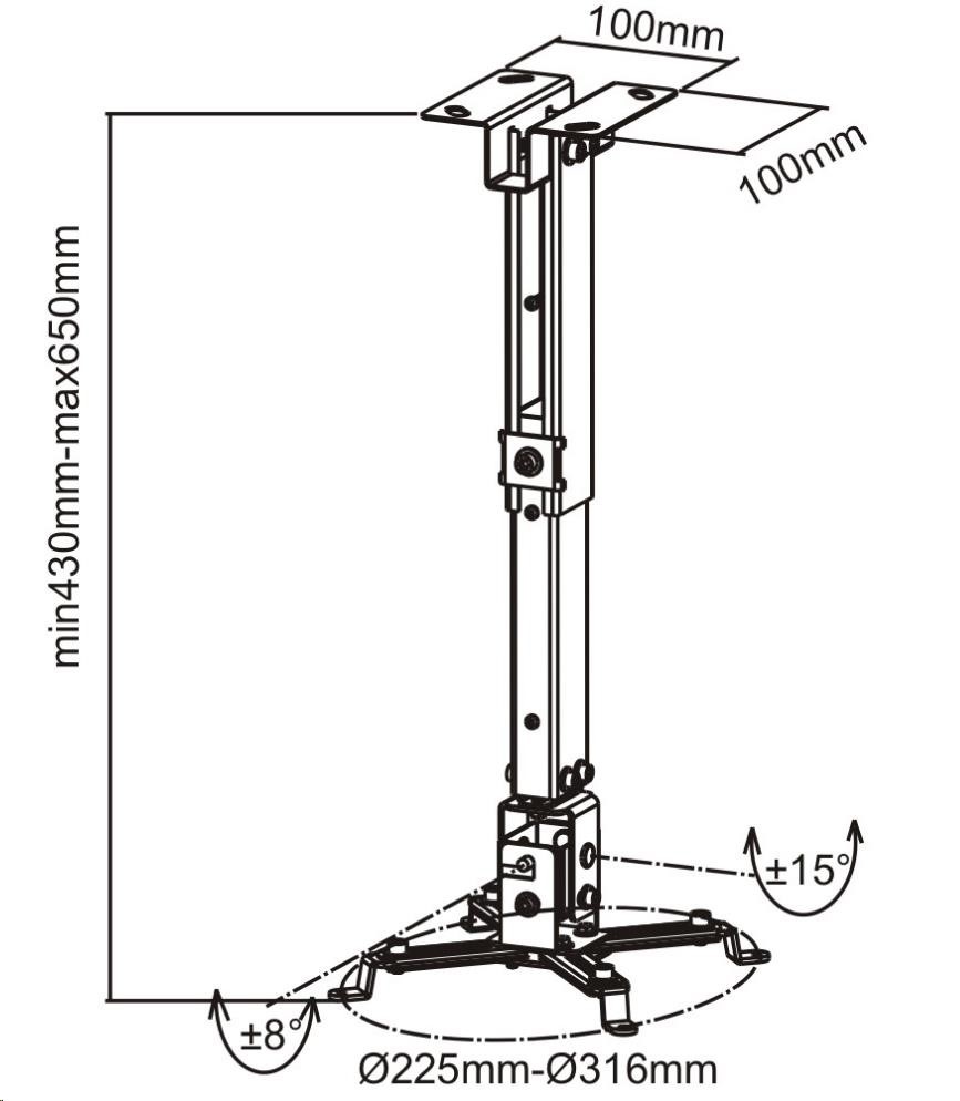 Všeobecný držiak na montáž projektora na strop - farba: sivá - naklápanie: ±30° - ľahká a rýchla montáž - vrátane skrutiek a hmoždiniek - vzdialenosť projektora od stropu nastaviteľná: 43-65 cm - nosnosť: 20 kg
