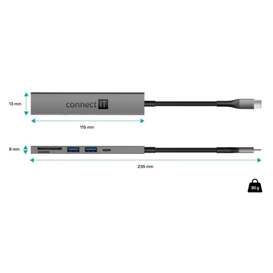 Prakticky tvarovaný USB-C hub pre pripojenie až 3 USB periférií (1 x USB-C a 2 x USB-A), 1x SD karty a 1x MicroSD karty. Umožní pripojenie napr. myši, klávesnice, MP3 prehrávača, skenera, tlačiarne, digitálneho fotoaparátu, externého pevného disku, flashdisku atď.