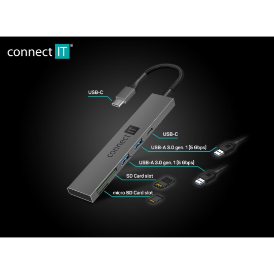 CONNECT IT USB-C hub, 2x USB-A, 1x USB-C, 1x SD karta, 1x MicroSD karta, šedá