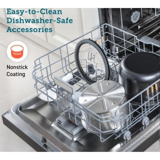 Nepriľnavý povrch zabraňuje prilepeniu potravín a uľahčuje čistenie, ktoré je možné aj v umývačke riadu s celým príslušenstvom.