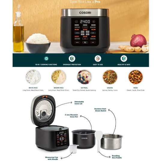Multifunkčný rýžovar Cosori ponúka rôzne možnosti prípravy pokrmov: rôzne druhy a úrovne prípravy ryže (podľa chuti - štandardná, mäkká alebo tvrdšia), kaše a iné obilniny, ale aj ďalšie funkcie ako režim pomalého varenia, varenie v pare, dusenie, režim udržiavania teploty, odložené varenie, pečenie alebo režim rýchlej prípravy ryže.