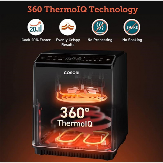 S teplovzdušnou fritézou COSORI CAF-P583S SMART si môžete bez výčitiek vychutnať svoje obľúbené vyprážané jedlá, pretože na rozdiel od bežného vyprážania alebo vyprážania je možné pripraviť jedlo s použitím veľmi malého alebo žiadneho oleja. Patentovaná technológia THERMO IQ 360° HEAT CIRCULATION presne reguluje teplotu pomocou inteligentného teplotného algoritmu, aby sa zabezpečilo rovnomerné uvarenie jedla bez potreby triasania alebo preklápania. Kombinácia cirkulujúceho horúceho vzduchu, perfektnej teploty varenia a inteligentných programov zabezpečí, že hranolky budú vždy krásne chrumkavé a kuracie stehná šťavnaté. Programy môžete rýchlo a pohodlne nastaviť aj prostredníctvom smartfónu alebo Amazon Alexa a Google Assistant. Keď skončíte, upratovanie bude rovnako jednoduché vďaka nepriľnavému košu, ktorý je možné umývať v umývačke riadu. Vďaka veľkej nádobe s objemom 6,4 l môžete rýchlo variť aj pre väčšiu rodinu alebo skupinu hostí.