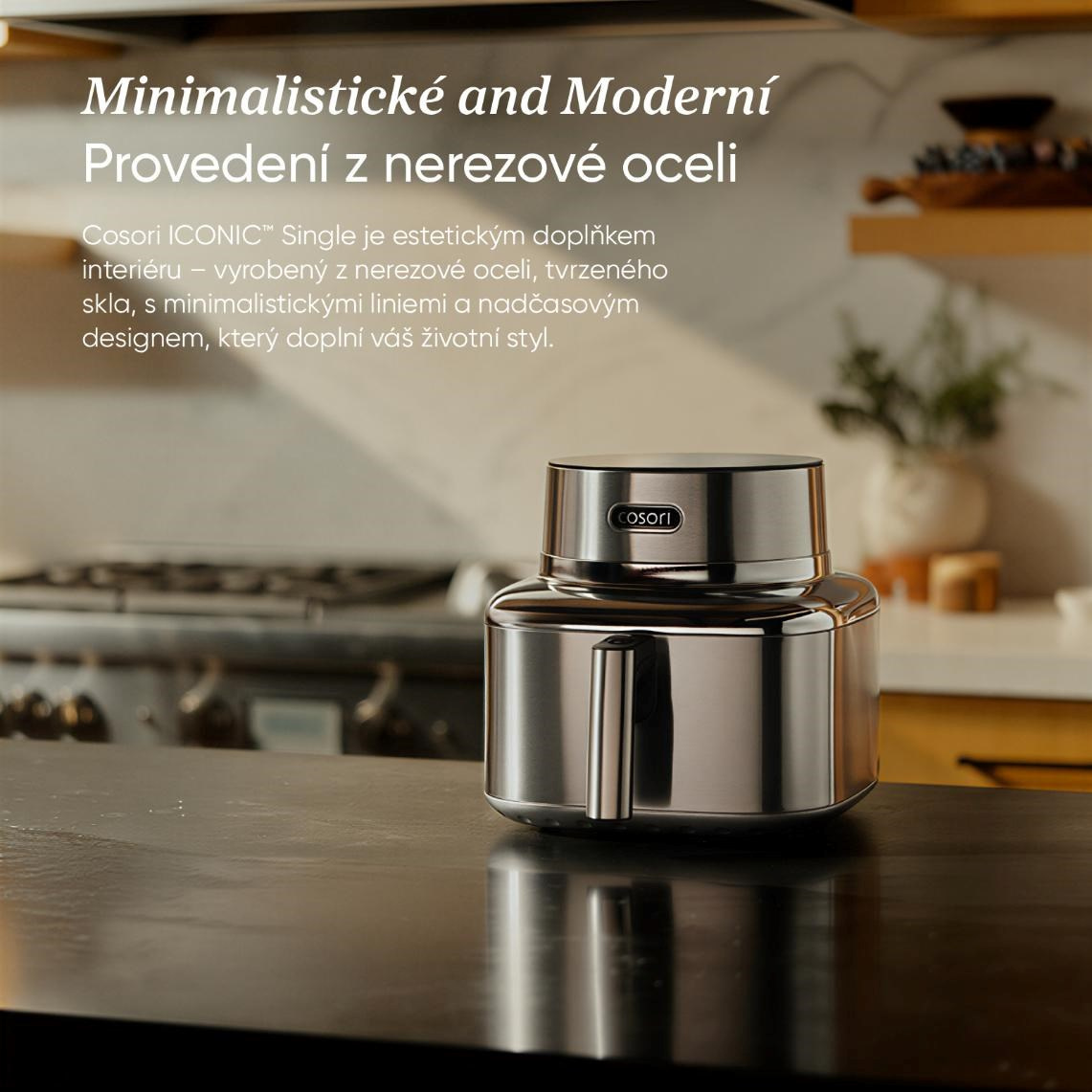 COSORI Iconic bol navrhnutý tak, aby bol prirodzenou súčasťou moderného interiéru, nie len obyčajným spotrebičom. Nerezová oceľ a tvrdené sklo vytvárajú čistý, pokojný vzhľad, ktorý krásne zapadá do minimalistických kuchýň. Je to predmet, ktorý poteší oko zakaždým, keď okolo neho prejdete.