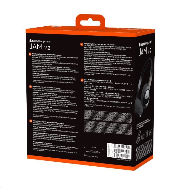 Vaše obľúbené prenosné Bluetooth® slúchadlá na uši sú späť – so starým dizajnom ľahkým ako pierko a vysoko kvalitnými neodymovými meničmi! Produkt Sound Blaster JAM V2 je teraz vybavený technológiou Bluetooth 5.0. Spolu s rozšírenými zvukovými kodekmi aptX™ HD a aptX™ Low Latency poskytuje najlepší bezdrôtový posuch. Užite si bohatý a ohromujúci zvuk. Funkcia Multipoint umožňuje jasne prepínať medzi dvoma rôznymi zdrojovými zariadeniami Bluetooth, bez toho aby ste stratili rytmus.