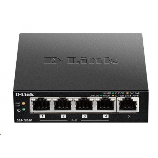 D-Link DGS-1005P 5-portový gigabitový stolový prepínač PoE+, 4 porty PoE+, rozpočet PoE 60 W