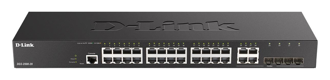 D-Link DGS-2000-28 je plne spravovateľný 28portový gigabitový riadený prepínač pre kancelárske a podnikové siete. Prepínač je vybavený 24 portami 10/100/1000M RJ-45 a štyrmi kombinovanými gigabitovými kombinovanými portami RJ-45/SFP s podporou 100M a 1000M vysielačov SFP (Mini-GBIC) na optické prepojenie. Konštrukcia bez ventilátora zaisťuje tichú prevádzku a umožňuje nasadenie priamo v kancelárii, súčasťou dodávky sú aj držiaky na montáž do 19" rackov. Prepínače D-Link radu DGS-2000 ponúkajú komplexnú sadu funkcií L2, bezpečnostných funkcií, funkcií kvality služieb (QoS) a základných funkcií L3 (max. 4 IP rozhrania, statické smerovanie s max. 128 záznamov IPv4/IPv6, predvolená trasa, IPv6 Neighbor Discovery). Riešenie prípadných problémov so sieťou uľahčuje štandard 802.3ah OAM, diagnostika káblov a jednosmerná detekcia prepojenia D-Link (DULD). Poskytovatelia internetových služieb ocenia funkcie Q-in-Q (Port Based), Multicast VLAN (ISM VLAN) alebo IGMP Authentication/Filtering na efektívnu prevádzku služieb IPTV. Prepínač sa spravuje prostredníctvom webového rozhrania, sériovej konzoly CLI, príkazov Telnet, SLL, SSH alebo SNMP. Na počiatočnú konfiguráciu a základnú správu je k dispozícii bezplatný softvérový nástroj D-Link Network Assistant (DNA) a mobilná aplikácia, zatiaľ čo na centrálnu správu väčších sietí je k dispozícii pokročilá platforma D-View 7...