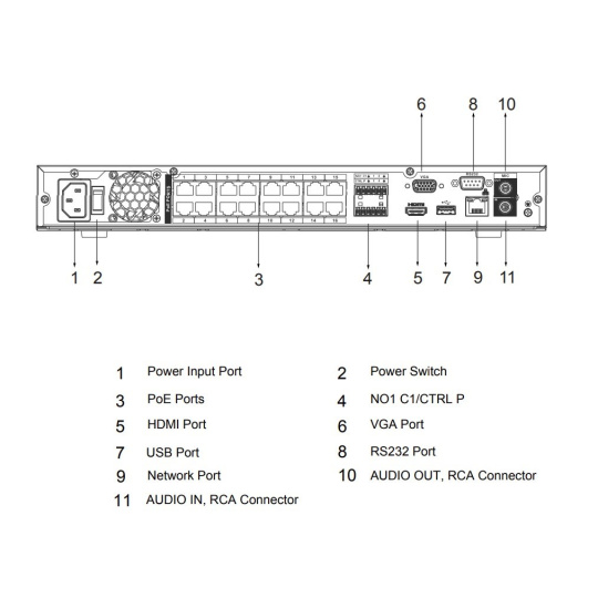 1× 10/100/1000 MbE RJ-45, 16× 10/100 Mb/s RJ-45 PoE (IEEE 802.3 af/at), 1× audio vstup (RCA), 1× zvukový výstup (RCA), 4× alarmový vstup, 2× budíkový výstup, 2× USB 2.0, 2× SATA HDD pozícia (max. 20 TB/disk), 1× HDMI, 1× VGA, 1× RS-232.