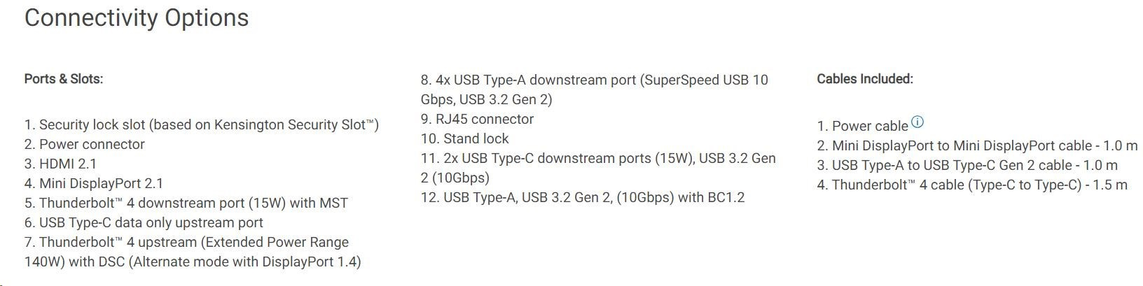 1. Power cable 2. Mini DisplayPort to Mini DisplayPort cable - 1.0 m 3. USB Type-A to USB Type-C Gen 2 cable - 1.0 m 4. Thunderbolt™ 4 cable (Type-C to Type-C) - 1.5 m |