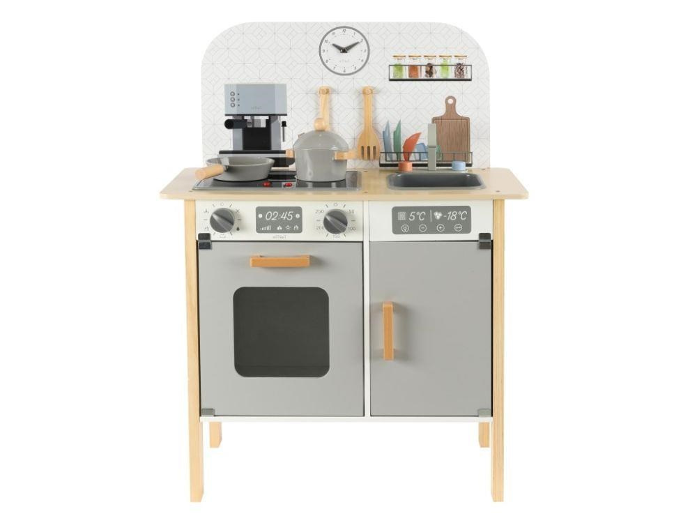 Menšia detská kuchynka v neutrálnych farbách, doplnená o bohaté príslušenstvo a textilný kuchársky set ZDARMA, premení dievčatá aj chlapcov na skutočných kuchárov. Kuchynka v škandinávskom štýle, so spotrebičmi a úžasnými doplnkami, je vhodná do každej miestnosti. Menšia drevená kuchynka je edukatívnou hračkou, ktorá umožní deťom vyskúšať si varenie, pečenie a ďalšie činnosti bezpečným detským spôsobom. Pri hraní v kuchynke deti zdokonalia svoje zručnosti a ešte si užijú veľa zábavy.