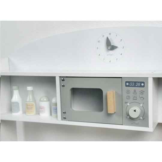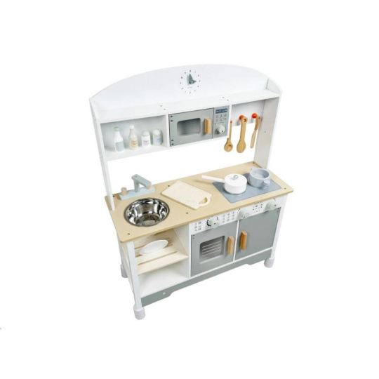 Drevená detská kuchynka v neutrálnej farebnej kombinácii bielej a šedej farby, doplnená bohatým príslušenstvom, je miestom, kde vaše dieťa môže vypustiť uzdu svojej fantázii a kreativite. Detská kuchynka so spotrebičmi aj riadom je edukatívnou hračkou, ktorá umožní deťom vyskúšať si varenie, pečenie a ostatné dospelácke činnosti bezpečným detským spôsobom. Vďaka pridavným nohám (nadstavcom) môžete kuchynku zdvihnúť o 6 cm.