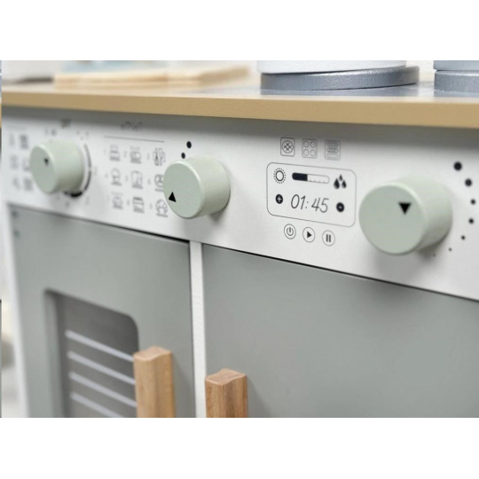 Štýlová drevená detská kuchynka umožní malým kuchárkam a kuchárom vrhnúť sa do varenia a pečenia, prípravy pokrmov a do kuchynských prác priamo vo svojej vlastnej kuchyni. V drevenej kuchynke v krásnom neutrálom farebnom prevedení môžu deti vypustiť uzdu svojej fantázii a premeniť sa na skutočných kulinárskych majstrov. K ruke im budú zabudované spotrebiče aj riad, s ktorým pôjde varenie aj pečenie ako po masle. V kuchynke nechýba pečiaca rúra, mikrovlnná rúra, sporák so 2 platňami, drez na špinavé riady ani hodiny. Pre prípravu chutných pokrmov je detská kuchynka dovybavená rôznymi koreninami. Táto edukatívna hračka umožní deťom vyskúšať si dospelácke činnosti bezpečným detským spôsobom. K náteru sa používajú vodou riediteľné farby, vhodné a bezpečné pre deti. Vďaka pridavným (nasadzovacím) nohám porastie kuchynka s vaším dieťaťom, po pridaní nôh sa celá (teda aj pracovná doska) zdvihne o 6 cm.