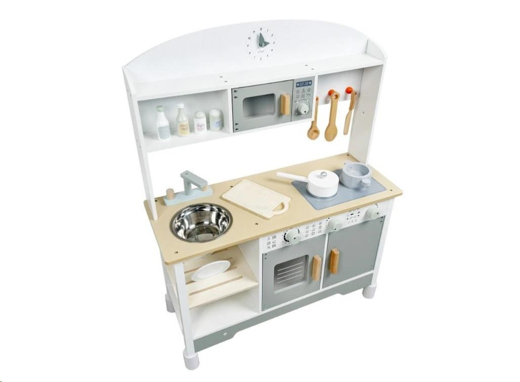 Štýlová drevená detská kuchynka umožní malým kuchárkam a kuchárom vrhnúť sa do varenia a pečenia, prípravy pokrmov a do kuchynských prác priamo vo svojej vlastnej kuchyni. V drevenej kuchynke v krásnom neutrálom farebnom prevedení môžu deti vypustiť uzdu svojej fantázii a premeniť sa na skutočných kulinárskych majstrov. K ruke im budú zabudované spotrebiče aj riad, s ktorým pôjde varenie aj pečenie ako po masle. V kuchynke nechýba pečiaca rúra, mikrovlnná rúra, sporák so 2 platňami, drez na špinavé riady ani hodiny. Pre prípravu chutných pokrmov je detská kuchynka dovybavená rôznymi koreninami. Táto edukatívna hračka umožní deťom vyskúšať si dospelácke činnosti bezpečným detským spôsobom. K náteru sa používajú vodou riediteľné farby, vhodné a bezpečné pre deti. Vďaka pridavným (nasadzovacím) nohám porastie kuchynka s vaším dieťaťom, po pridaní nôh sa celá (teda aj pracovná doska) zdvihne o 6 cm.
