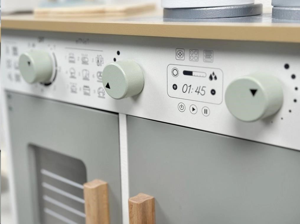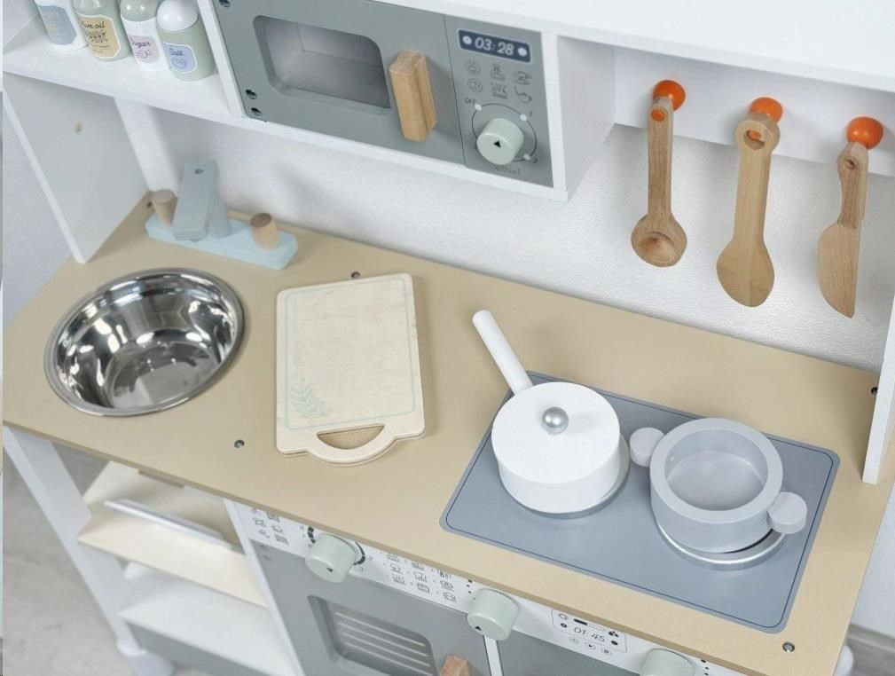 Drevená detská kuchynka v neutrálnej farebnej kombinácii bielej a šedej farby, doplnená bohatým príslušenstvom, je miestom, kde vaše dieťa môže vypustiť uzdu svojej fantázii a kreativite. Detská kuchynka so spotrebičmi aj riadom je edukatívnou hračkou, ktorá umožní deťom vyskúšať si varenie, pečenie a ostatné dospelácke činnosti bezpečným detským spôsobom. Vďaka pridavným nohám (nadstavcom) môžete kuchynku zdvihnúť o 6 cm.