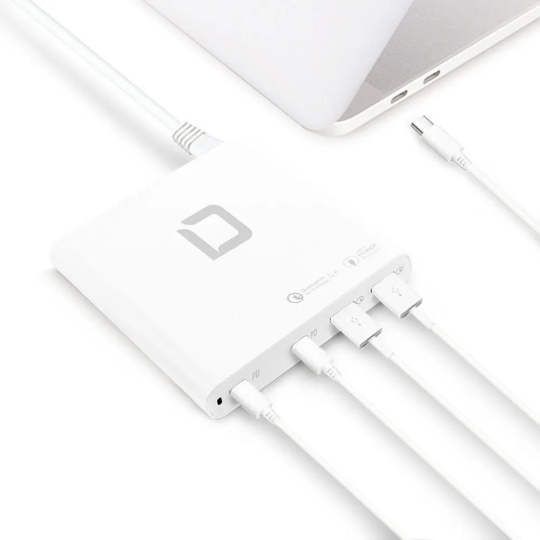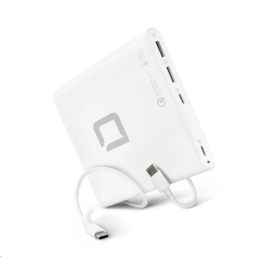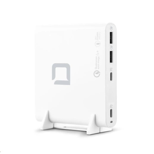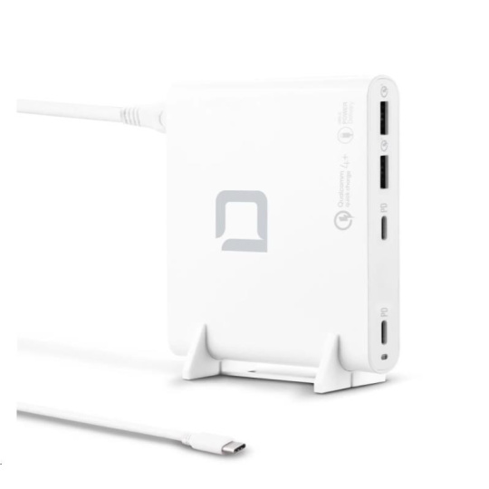Príslušenstvo je možné používať vo viac ako 180 krajinách a je vybavené dvoma USB-C výstupmi s technológiou Power Delivery 3.0 a dvoma portmi USB-A s technológiou Qualcomm Quick Charge 4.0+. Maximálny výkon nabíjacej stanice je 120 W. Výstupné napätie (5 - 20 V) a nabíjací prúd (až 5 A) sa automaticky prispôsobujú pripojeným zariadeniam. Inteligentný riadiaci systém šetrí batériu a zároveň poskytuje spoľahlivú ochranu proti nadprúdu, prepätiu, zkratu a prehriatiu. Elegantný dizajn, kompaktný tvar a hmotnosť len 240 gramov - ideálny spoločník pre rýchle a efektívne získavanie energie doma, v kancelárii alebo na cestách. Súčasťou je plastová podpera, ktorá zabraňuje prehriatiu.