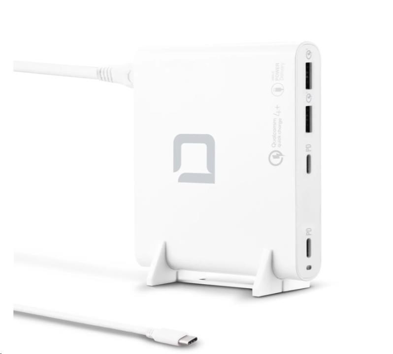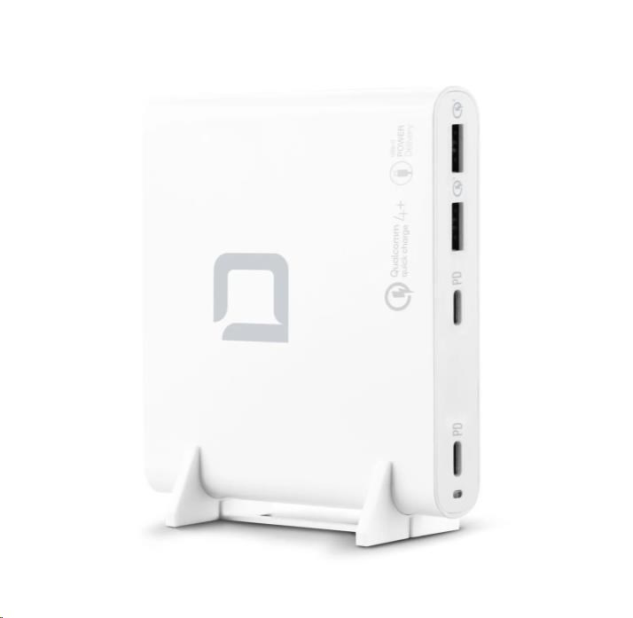 Príslušenstvo je možné používať vo viac ako 180 krajinách a je vybavené dvoma USB-C výstupmi s technológiou Power Delivery 3.0 a dvoma portmi USB-A s technológiou Qualcomm Quick Charge 4.0+. Maximálny výkon nabíjacej stanice je 120 W. Výstupné napätie (5 - 20 V) a nabíjací prúd (až 5 A) sa automaticky prispôsobujú pripojeným zariadeniam. Inteligentný riadiaci systém šetrí batériu a zároveň poskytuje spoľahlivú ochranu proti nadprúdu, prepätiu, zkratu a prehriatiu. Elegantný dizajn, kompaktný tvar a hmotnosť len 240 gramov - ideálny spoločník pre rýchle a efektívne získavanie energie doma, v kancelárii alebo na cestách. Súčasťou je plastová podpera, ktorá zabraňuje prehriatiu.