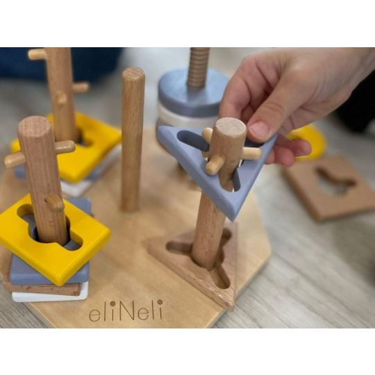 Navlékacie tvary v krásnych neutrálnych farbách deti nasadzujú na drevené kolíky, ktoré však nie sú úplne hladké a deťom navliekanie sťažujú rôznymi výstupkami. Niekedy táto hra vyžaduje veľa trpezlivosti.