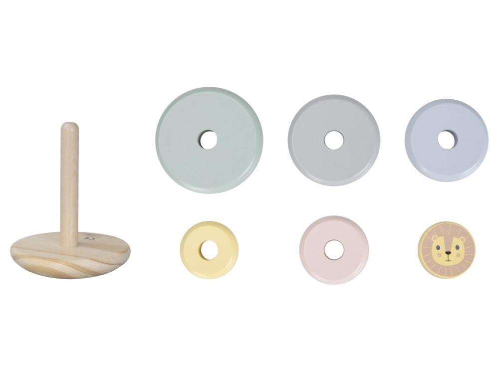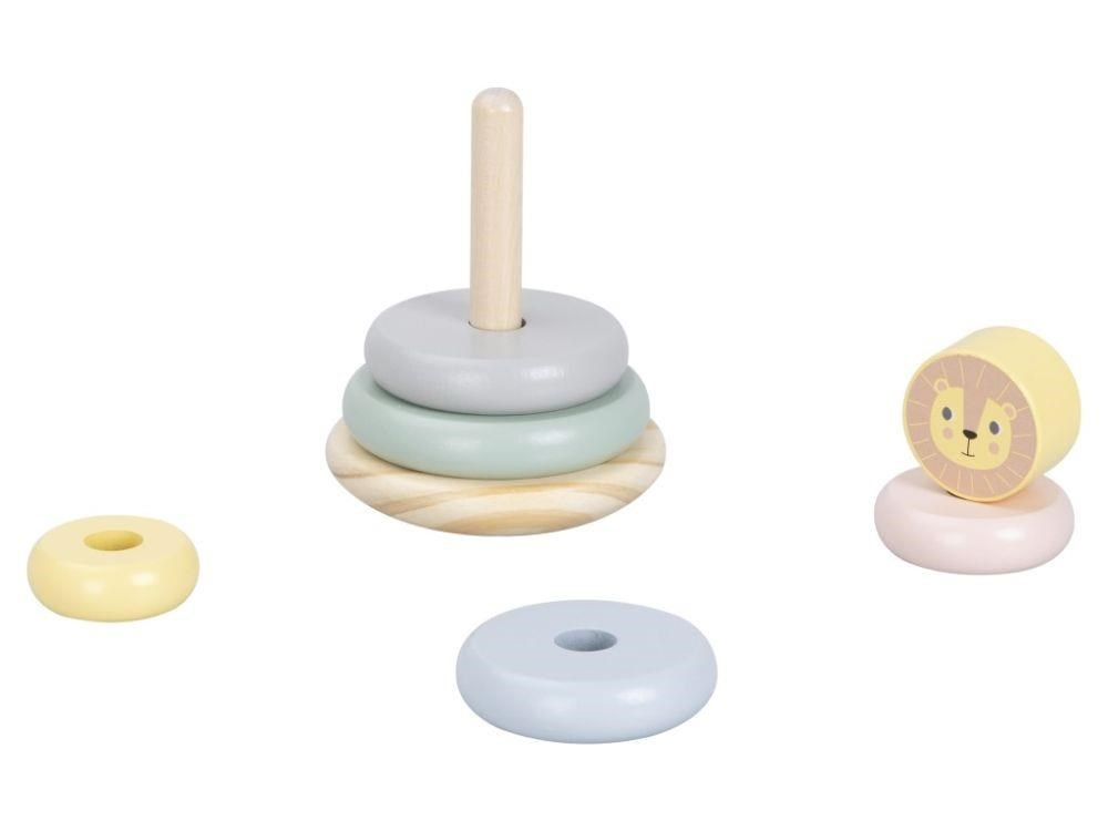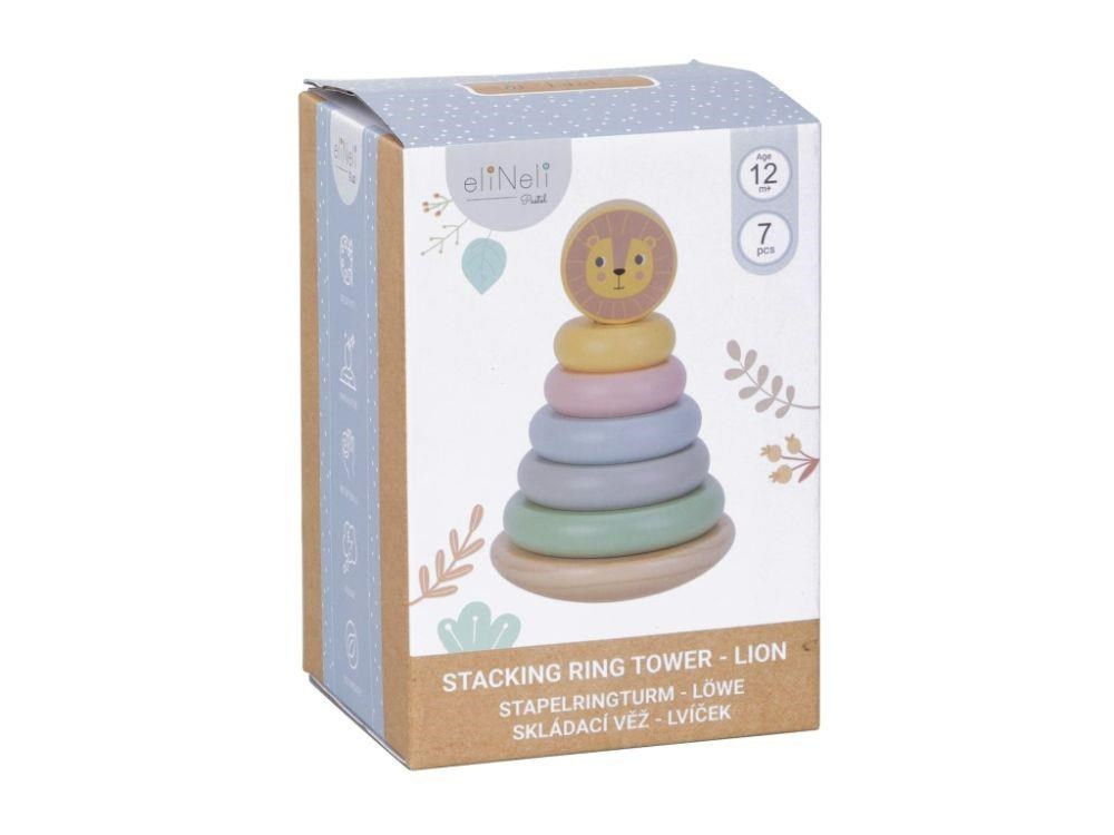Skládacia veža (pyramída) je obľúbená drevená hračka, ktorá nesmie chýbať v žiadnom detskom kráľovstve. Skládacia veža s kruhmi v jemných pastelových farbách a levíčkom zdokonaľuje jemnú motoriku, koordináciu očí a rúk, logické myslenie, učí deti rozpoznávať rozdiel medzi väčším a menším, sústrediť sa a trpezlivosti.