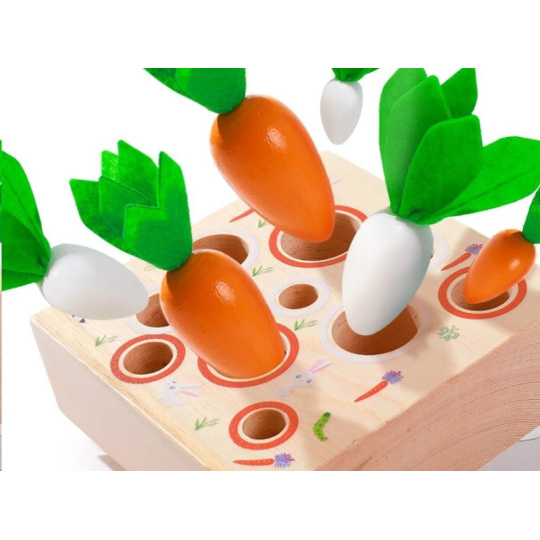 Originálna detská vkladačka s rôzne veľkými otvormi a s rôzne veľkými mrkvičkami zdokonalí motorické zručnosti, koordináciu očí a rúk a potrápi aj detskú myseľ. Pri vkladaní je potrebné vybrať mrkvičku alebo petržlen vo správnej veľkosti. Pre veľké šikulky je vkladacia hra zložitá farebnými krúžkami okolo otvorov, aby deti museli vybrať nielen správnu veľkosť, ale aj farbu zeleniny. Pri hre deti prirodzeným spôsobom zdokonaľujú svoje zručnosti, učia sa rozoznávať farby, rozdiel medzi väčším a menším, zdokonaľujú logické myslenie, učia sa trpezlivosti a sústredenia a určite si užijú aj veľa zábavy.