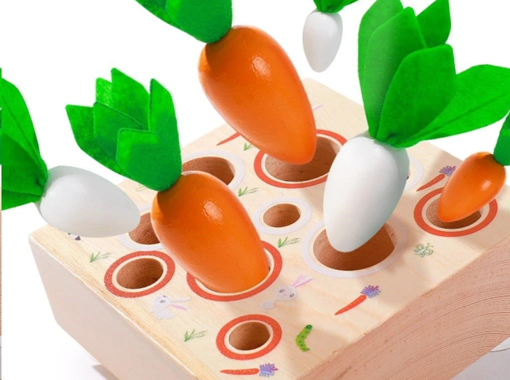 Originálna detská vkladačka s rôzne veľkými otvormi a s rôzne veľkými mrkvičkami zdokonalí motorické zručnosti, koordináciu očí a rúk a potrápi aj detskú myseľ. Pri vkladaní je potrebné vybrať mrkvičku alebo petržlen vo správnej veľkosti. Pre veľké šikulky je vkladacia hra zložitá farebnými krúžkami okolo otvorov, aby deti museli vybrať nielen správnu veľkosť, ale aj farbu zeleniny. Pri hre deti prirodzeným spôsobom zdokonaľujú svoje zručnosti, učia sa rozoznávať farby, rozdiel medzi väčším a menším, zdokonaľujú logické myslenie, učia sa trpezlivosti a sústredenia a určite si užijú aj veľa zábavy.